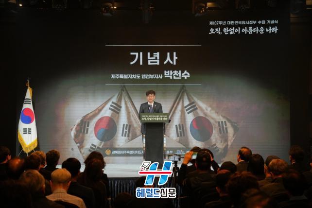 ¹Úõ¼ö µµÁö»ç ±ÇÇÑ´ëÇàÀº¡°´ëÇѹα¹ ÀÓ½ÃÁ¤ºÎÀÇ ¹ýÅë°ú ¼±¿µéÀÇ µ¶¸³ Á¤½ÅÀº ¿À´Ã³¯ ´ëÇѹα¹ÀÇ ÀÚÀ¯¿Í ¹ÎÁÖÁÖÀǸ¦ ¶°¹ÞÄ¡´Â ±Ù°£¡±À̶ó¸ç,¡°±× Á¤½ÅÀº Áö³ÇØ µµ¹Î°ú ÇÔ²² ¼±Æ÷ÇÑ ¡®Á¦ÁÖÆòÈÀαÇÇåÀ塯¿¡µµ À̾îÁ® ÀÖ´Ù¡±°í ¸»Çß´Ù. ÀÌ¾î ¡°Á¦ÁÖµµ´Â ÇåÀåÀÇ °¡Ä¡¸¦ ¹ÙÅÁÀ¸·Î ¡®¼¼°èÆòÈÀÇ ¼¶¡¯ÀÇ ¿ªÇÒÀ» ´õ¿í °ÈÇϰí, ±¹°¡À¯°øÀÚ¿Í À¯°¡Á·¿¡ ´ëÇÑ Á¸°æ°ú ¿¹¿ì¿¡µµ ÃÖ¼±À» ´ÙÇϰڴ١±°í °Á¶Çß´Ù.