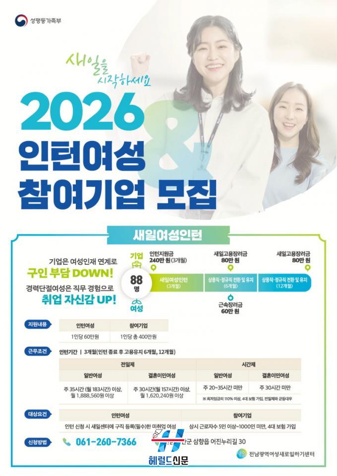 [Çì·²µå½Å¹® = ³ë½Â¾ð ±âÀÚ] Àü³²¿©¼º°¡Á·Àç´Ü Àü³²±¤¿ª»õÀϼ¾ÅÍ´Â ¿©¼ºÀÇ ÀçÃë¾÷À» µ½°í ±â¾÷ÀÇ Àη³À» ÇØ¼ÒÇϱâ À§ÇØ ¡®2026 »õÀÏ¿©¼ºÀÎÅÏ¡¯ »ç¾÷À» ÃßÁøÇÑ´Ù.
