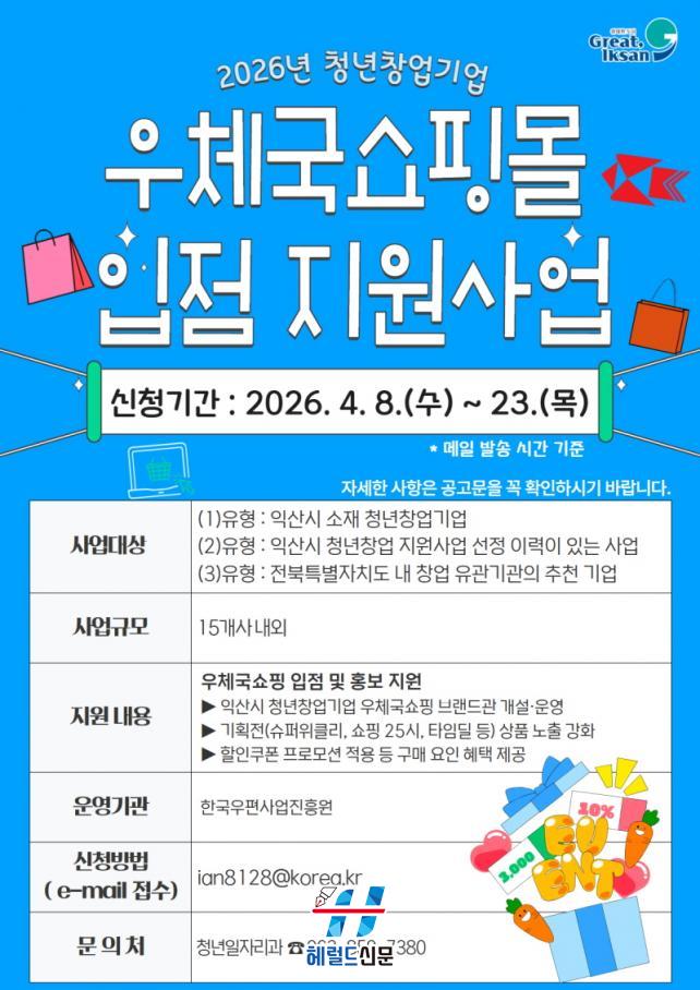 ÀÍ»ê½Ã´Â '2026³â û³ââ¾÷±â¾÷ ¿ìü±¹¼îÇθô ÀÔÁ¡ Áö¿ø»ç¾÷'¿¡ Âü¿©ÇÒ Ã»³ââ¾÷±â¾÷À» ¿À´Â 23ÀϱîÁö ¸ðÁýÇÑ´Ù.