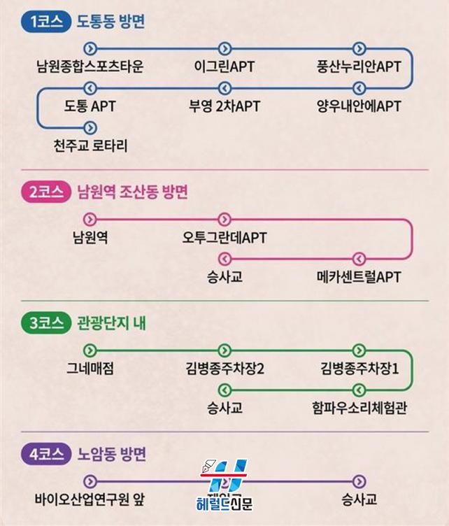 ¹«·á ¼ÅƲ¹ö½º´Â ÃÑ 4°³ ³ë¼±À¸·Î ¿î¿µµÇ¸ç, ±¸Ã¼ÀûÀÎ ±¸°£Àº ¡ã1³ë¼± ³²¿øÁ¾ÇÕ½ºÆ÷Ã÷Ÿ¿î ¡ê õÁÖ±³ ·ÎŸ¸® ¡ã2³ë¼± ³²¿ø¿ª ¡ê ½Â»ç±³ ¡ã3³ë¼± ±×³×¸ÅÁ¡ ¡ê ½Â»ç±³ ¡ã4³ë¼± ³²¿ø¹ÙÀÌ¿À»ê¾÷¿¬±¸¿ø ¡ê ½Â»ç±³ µîÀÌ´Ù. ¿îÇà ½Ã°£Àº ¿ÀÀü 10½ÃºÎÅÍ ¿ÀÈÄ 11½Ã±îÁöÀ̸ç, ¾à 15~30ºÐ °£°ÝÀ¸·Î ¼øÈ¯ ¿îÇàÇÑ´Ù.