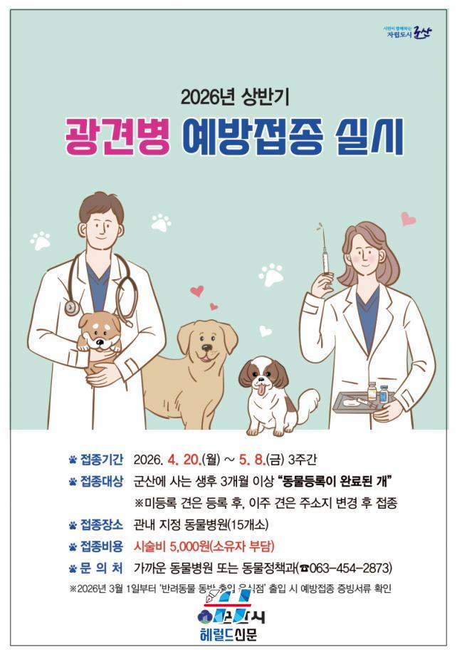 [Çì·²µå½Å¹® = ³ë½Â¾ð ±âÀÚ] ±º»ê½Ã´Â 4¿ù 20ÀϺÎÅÍ 5¿ù 8ÀϱîÁö 3ÁÖ°£ °ü³» µ¿¹°º´¿ø 15°³¼Ò¿¡¼ »ó¹Ý±â ±¤°ßº´ ¿¹¹æÁ¢Á¾À» ½Ç½ÃÇÑ´Ù°í ¹àÇû´Ù.