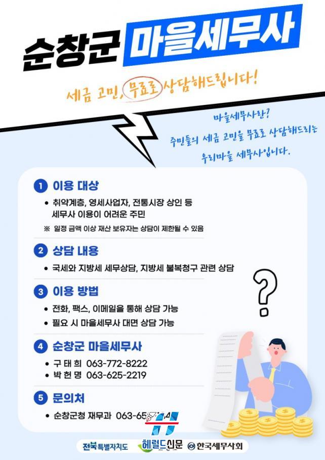 ÇöÀç ¼øÃ¢±º¿¡´Â 2¸íÀÇ ¸¶À»¼¼¹«»ç°¡ Ȱµ¿ ÁßÀ̸ç, ¼¼¹«»ó´ãÀ» Èñ¸ÁÇÏ´Â ±º¹ÎÀº ³²¿ø ¼ÒÀç ¼¼¹«»ç(063-772-8222, 063-625-2219) ÀüÈ ¶Ç´Â ¼¸é»ó´ãÀ» ½ÅûÇÏ¸é µÈ´Ù.