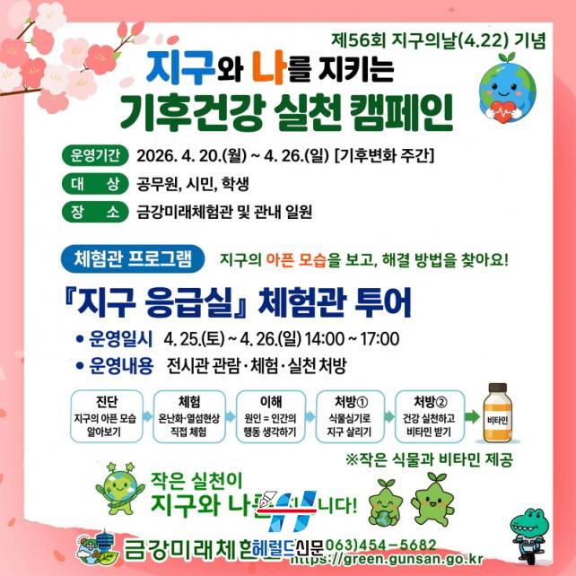[Çì·²µå½Å¹® = ³ë½Â¾ð ±âÀÚ] ±º»ê½Ã´Â Á¦56ȸ Áö±¸ÀÇ ³¯(4¿ù 22ÀÏ)°ú ±âÈĺ¯ÈÁÖ°£À» ¸Â¾Æ ½Ã¹ÎµéÀÇ ±âÈÄÀ§±â ´ëÀÀ Âü¿©¸¦ À¯µµÇϱâ À§ÇØ 4¿ù 20ÀϺÎÅÍ 26ÀϱîÁö ¡®Áö±¸¿Í ³ª¸¦ ÁöŰ´Â ±âÈİǰ ½Çõ Ä·ÆäÀΡ¯À» ¿î¿µÇÑ´Ù°í ¹àÇû´Ù.