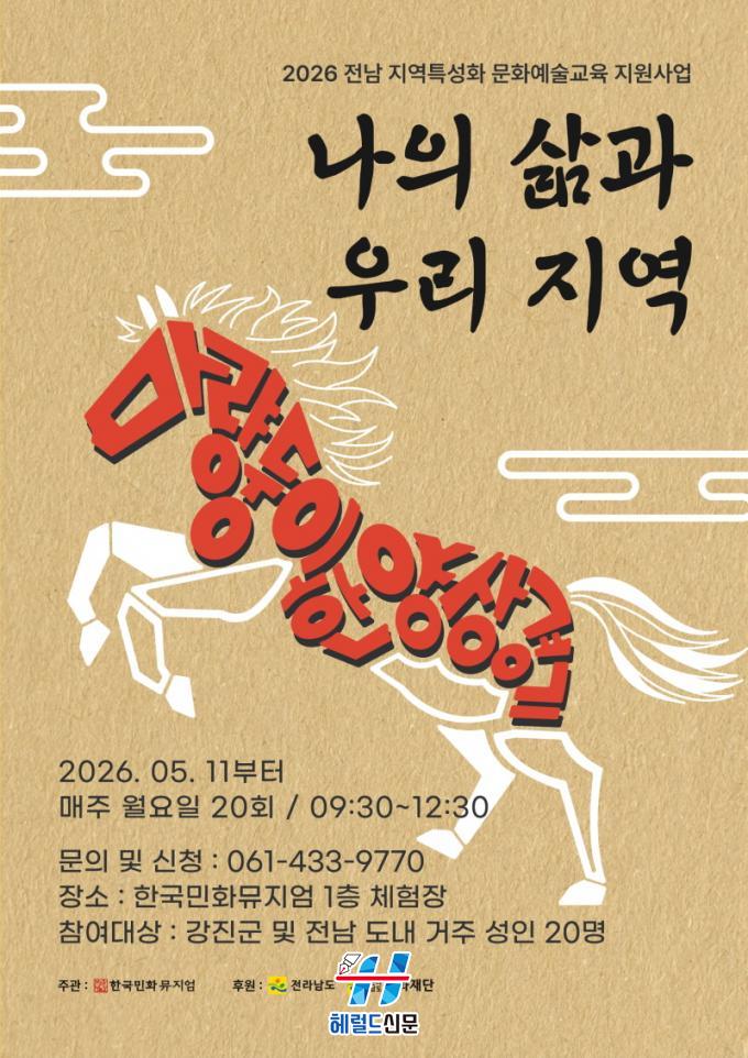 [Çì·²µå½Å¹® = Àü¿µ±Ô ±âÀÚ] °Áø±º ´ë±¸¸é¿¡ ÀÖ´Â Çѱ¹¹ÎȹÂÁö¾ö(°üÀå ¿À½½±â)ÀÌ ¡®2026 Áö¿ªÆ¯¼ºÈ ¹®È¿¹¼ú±³À° Áö¿ø»ç¾÷¡¯ ¼±Á¤¿¡ µû¶ó ¿À´Â 5¿ù 11ÀϺÎÅÍ ¡®³ªÀÇ »î°ú ¿ì¸® Áö¿ª–¸¶·®µÕÀÌÀÇ ÇÑ¾ç »ó°æ±â¡¯ ÇÁ·Î±×·¥ ¿î¿µÀ» ½ÃÀÛÇϸç Âü°¡ÀÚ¸¦ ¸ðÁýÇÑ´Ù.