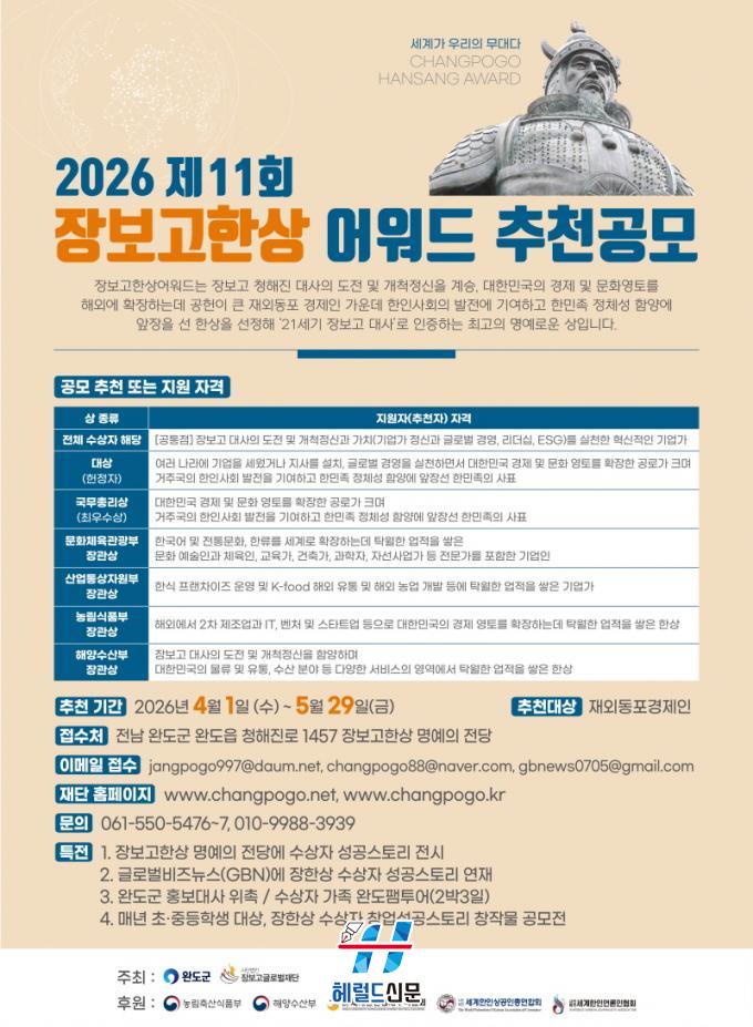Ãßõ ±â°£Àº 5¿ù 29ÀϱîÁö´Ù. ÃßõÀº À庸°í±Û·Î¹úÀç´Ü, À庸°íÇÑ»ó ¸í¿¹ÀÇ Àü´ç ´©¸®Áý, ±Û·Î¹ú ºñÁî´º½º(www.gbnews.kr)¿¡¼ ¡®À庸°í ÇÑ»ó ¾î¿öµå¡¯ Èĺ¸ÀÚ Ãßõ¼¸¦ ³»·Á¹Þ¾Æ ÀÛ¼ºÇÑ µÚ À̸ÞÀÏ(jangpogo12@naver.com)·Î ÇÏ¸é µÈ´Ù.
