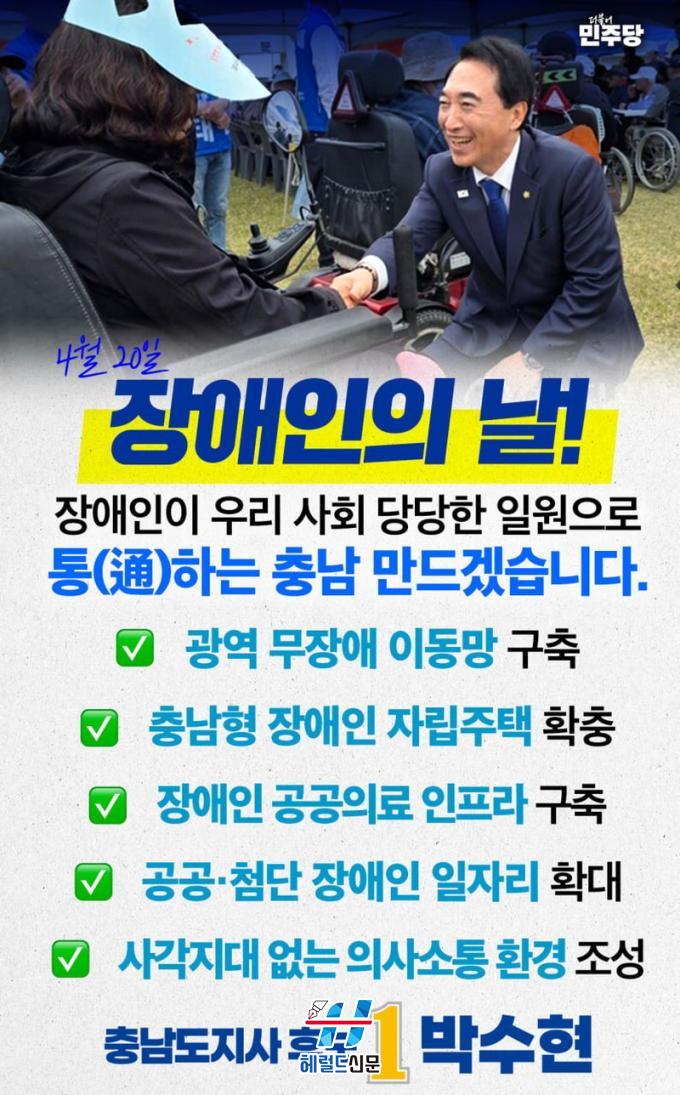 [Çì·²µå½Å¹® = ³ë½Â¾ð ±âÀÚ] ¹Ú¼öÇö ´õºÒ¾î¹ÎÁÖ´ç ÃæÃ»³²µµÁö»ç Èĺ¸(´õºÒ¾î¹ÎÁÖ´ç Ãæ³² °øÁÖ¡¤ºÎ¿©¡¤Ã»¾ç ±¹È¸ÀÇ¿ø)´Â ¿À´Ã(20ÀÏ) Á¦ 46ȸ Àå¾ÖÀÎÀÇ ³¯À» ¸Â¾Æ ¡°Ãæ³²ÀÇ 13¸¸ Àå¾ÖÀÎÀÌ ¿ì¸® »çȸÀÇ ´ç´çÇÑ ÀÏ¿øÀ¸·Î ÅëÇÏ´Â »çȸ¸¦ ¸¸µé°Ú´Ù¡±¸ç Àå¾ÖÀÎ À̵¿¡¤ÀÚ¸³¡¤°Ç°¡¤ÀÏÀÚ¸®¡¤±ÇÀÍÀÌ º¸ÀåµÇ´Â Ãæ³²ÀÇ ºñÀüÀ» ¹àÇû´Ù.