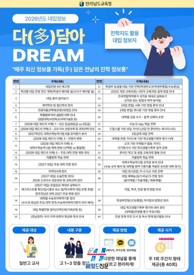 [Çì·²µå½Å¹® = ³ë½Â¾ð ±âÀÚ] Àü¶ó³²µµ±³À°Ã»ÀÌ ±Þº¯ÇÏ´Â ´ëÀÔ È¯°æ¿¡ ¼±Á¦ÀûÀ¸·Î ´ëÀÀÇϰí Çб³ ÇöÀåÀÇ ÁøÇÐÁöµµ ¿ª·®À» °ÈÇϱâ À§ÇØ ¸ÂÃãÇü ´ëÀÔ Á¤º¸Áö ¡®´Ù(Òý)´ã¾Æ DREAM¡¯À» ¹ß°£¡¤¿î¿µÇÑ´Ù.