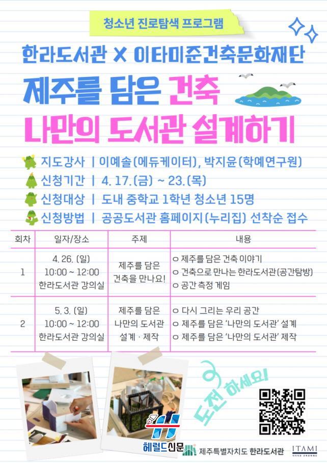 [Çì·²µå½Å¹® = ³ë½Â¾ð ±âÀÚ] Á¦ÁÖÆ¯º°ÀÚÄ¡µµ ÇѶ󵵼°üÀº ¿À´Â 4¿ù 26ÀϺÎÅÍ 5¿ù 3ÀϱîÁö ¸ÅÁÖ ÀÏ¿äÀÏ, ÀÌŸ¹ÌÁØ °ÇÃ๮ÈÀç´Ü°ú ÇÔ²² µµ³» ÁßÇб³ 1Çгâ ÇлýµéÀ» À§ÇÑ ¡®Ã»¼Ò³â °ÇÃ๮ȱ³À° ÇÁ·Î±×·¥¡¯À» ¿î¿µÇÑ´Ù.