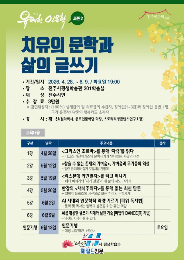 [Çì·²µå½Å¹® = ³ë½Â¾ð ±âÀÚ] ÀüÁֽ𡠽ùεéÀÌ Àι®ÇÐÀ» ÅëÇØ ÇູÇÑ »îÀÇ ÁöÇý¸¦ ¹è¿ï ¼ö ÀÖµµ·Ï »ýȰ ¼Ó Àι®ÇÐ ÇÁ·Î±×·¥À» ¿î¿µÇÑ´Ù.