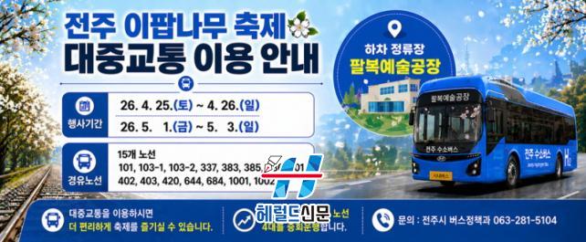 ÀüÁֽô ¿À´Â 25ÀÏ~26ÀÏ, 5¿ù 1ÀÏ~3ÀÏ µî ÃÑ 5Àϰ£ ÆÈº¹¿¹¼ú°øÀå ÀÏ´ë¿¡¼ ÆîÃÄÁö´Â ¡®2026 ÀüÁÖ ÀÌÆË³ª¹« ÃàÁ¦¡¯¿¡ ¸ÂÃç ¹æ¹®°´ ÁýÁß ½Ã±â¿¡ ½Ã³»¹ö½º ¿îÇàÀ» Á¶Á¤ÇÏ´Â µî ±³Åë¼ö¿ä Áß½ÉÀÇ ¿î¿µ ´ëÃ¥À» ÃßÁøÇÑ´Ù°í 23ÀÏ ¹àÇû´Ù.