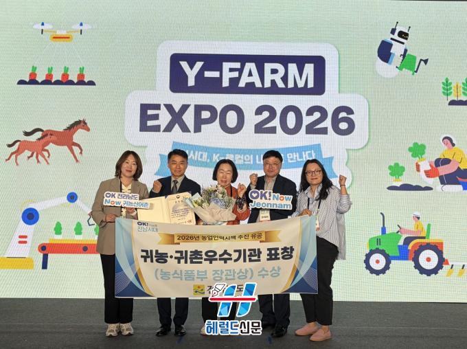 [Çì·²µå½Å¹® = ³ë½Â¾ð ±âÀÚ] Àü¶ó³²µµ´Â 24ÀÏ ¼ö¿øÄÁº¥¼Ç¼¾ÅÍ¿¡¼ ¿¸° ¡®2026 ¿ÍÀÌÆÊ ¿¢½ºÆ÷(Y-FARM EXPO)¡¯¿¡¼ ³ó¸²Ãà»ê½ÄǰºÎÀÇ ³ó¾÷ÀηÂÀ°¼º½ÃÃ¥ ÃßÁø À¯°øÀÚ Ç¥Ã¢¿¡¼ ±Í³ó¾î±ÍÃÌ ¿ì¼ö½ÃÃ¥ ÃßÁø±â°üÀ¸·Î ¼±Á¤µÅ Àå°ü»óÀ» ¹Þ¾Ò´Ù.
