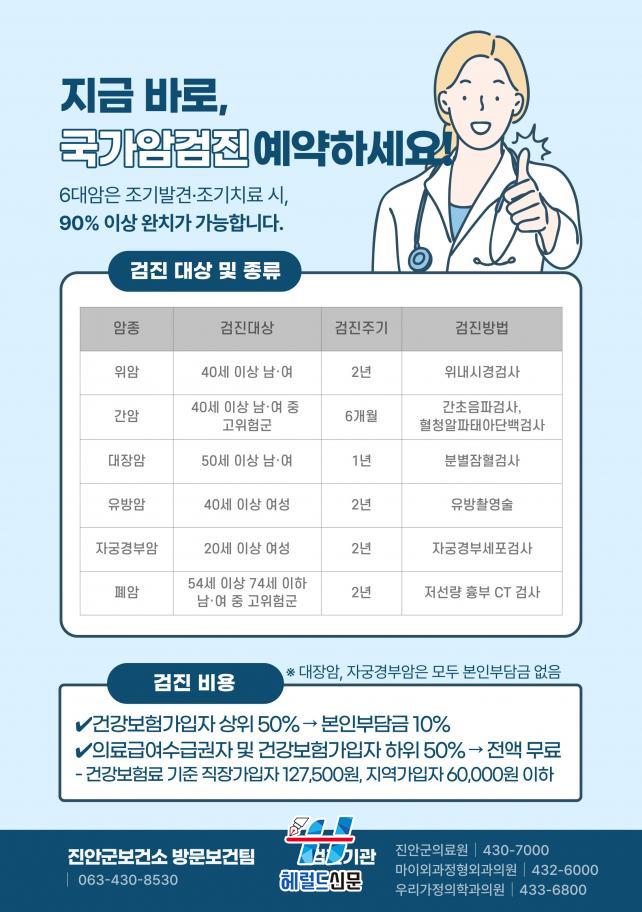±¹°¡¾Ï°ËÁø ´ë»ó ¿©ºÎ È®ÀÎ ¹× ¹®ÀÇ´Â Áø¾È±ºº¸°Ç¼Ò ¹æ¹®º¸°ÇÆÀ(¢Ï 063-430-8530)À¸·Î ÇÏ¸é µÈ´Ù.