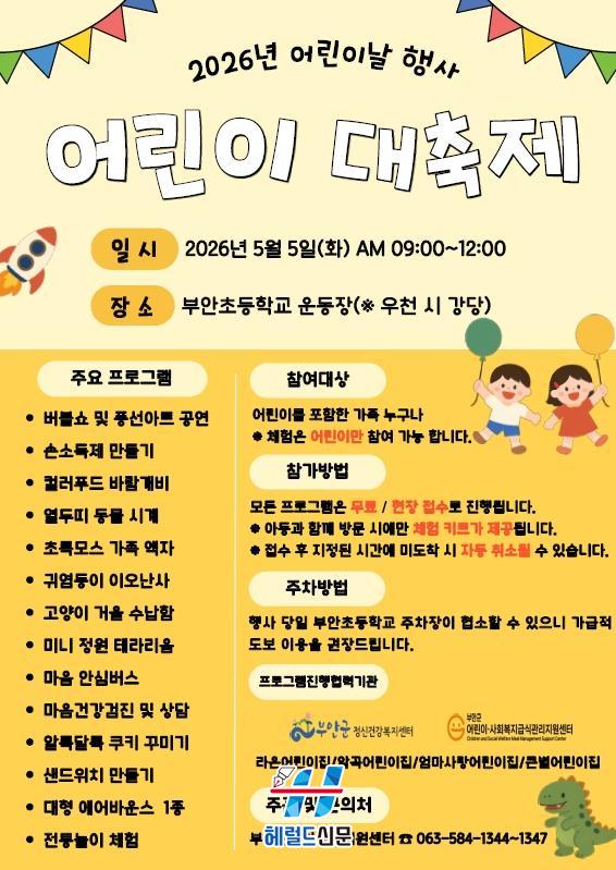 [Çì·²µå½Å¹® = ³ë½Â¾ð ±âÀÚ] ºÎ¾È±ºÀ°¾ÆÁ¾ÇÕÁö¿ø¼¾ÅÍ(´ëÇ¥ ÀÓ¿¬ÀÚ)´Â ¿À´Â 5¿ù 5ÀÏ ¿ÀÀü 9½ÃºÎÅÍ 12½Ã±îÁö ºÎ¾ÈÃʵîÇб³ ¿îµ¿Àå¿¡¼ ¡®¾î¸°ÀÌ ´ëÃàÁ¦¡¯¸¦ °³ÃÖÇÑ´Ù°í ¹àÇû´Ù.