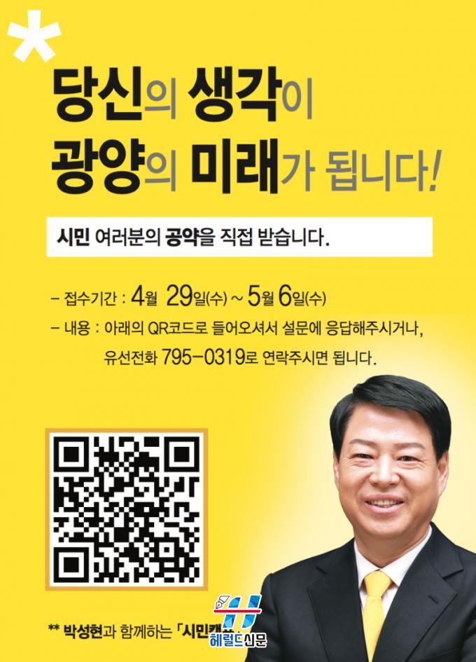 ¹Ú¼ºÇö ¿¹ºñÈ帴 29ÀÏ ¡°´ç½ÅÀÇ »ý°¢ÀÌ ±¤¾çÀÇ ¹Ì·¡°¡ µË´Ï´Ù.¡±¶ó´Â ½½·Î°Ç ¾Æ·¡ ¿À´Ã(29ÀÏ)ºÎÅÍ 5¿ù6ÀϱîÁö ÀÏÁÖÀϰ£ ±¤¾ç½Ã¹ÎµéÀÇ °ø¾àÀ» ÁýÁßÀûÀ¸·Î Á¢¼öÇÑ´Ù°í ¹àÇû´Ù. ÀÌ´Â ½Ã¹ÎµéÀÇ ½Ç»ýȰ¿¡ ¹ÐÂøµÈ ¸ñ¼Ò¸®¸¦ Á÷Á¢ ¹Ý¿µÇϰڴٴ ¹Ú¼ºÇö Èĺ¸ÀÇ °·ÂÇÑ ÀÇÁö°¡ ´ã±ä Çຸ´Ù.