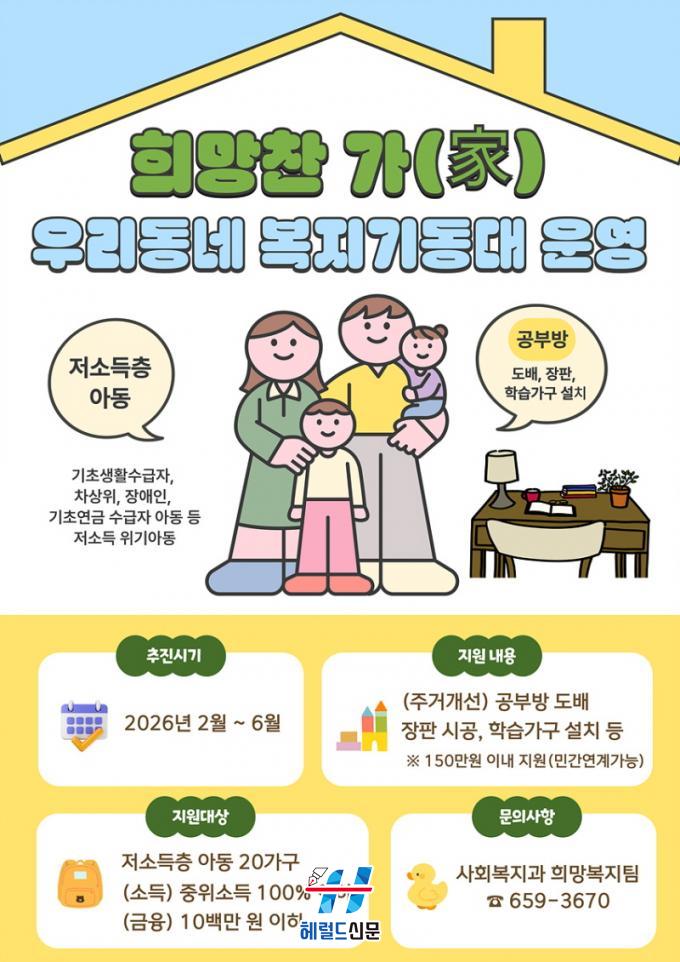 [Çì·²µå½Å¹® = ³ë½Â¾ð ±âÀÚ] ¿©¼ö½Ã(½ÃÀå Á¤±â¸í)´Â Àú¼ÒµæÃþ ¾Æµ¿ÀÇ ÇнÀ ¿©°Ç °³¼±°ú ¾ÈÀüÇÑ ÁְŰø°£ Á¶¼ºÀ» À§ÇØ 2026³â ÁÖ°Åȯ°æ °³¼±»ç¾÷ ¡®Èñ¸ÁÂù °¡(Ê«)¡¯¸¦ ÃßÁøÇÑ´Ù°í ¹àÇû´Ù.