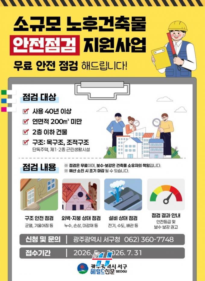 À̹ø »ç¾÷Àº ¾ÈÀü°ü¸® °ø¹éÀ» º¸¿ÏÇÏ°í °ÇÃ๰ ºØ±«¿Í ±Õ¿ µî »ýȰ ¾ÈÀü»ç°í¸¦ »çÀü¿¡ ¿¹¹æÇϱâ À§ÇØ ¸¶·ÃÇß´Ù. Áö¿ø ´ë»óÀº »ç¿ë½ÂÀÎ ÈÄ 40³â ÀÌ»ó °æ°úÇÑ ¿¬¸éÀû 200§³ ÀÌÇÏ, 2Ãþ ÀÌÇÏ ¹Î°£ °ÇÃ๰ÀÌ´Ù. ƯÈ÷ ¸ñ±¸Á¶¿Í Á¶Àû±¸Á¶ µî ±¸Á¶ÀûÀ¸·Î Ãë¾àÇÑ °ÇÃ๰À» ¿ì¼± Áö¿øÇÑ´Ù.