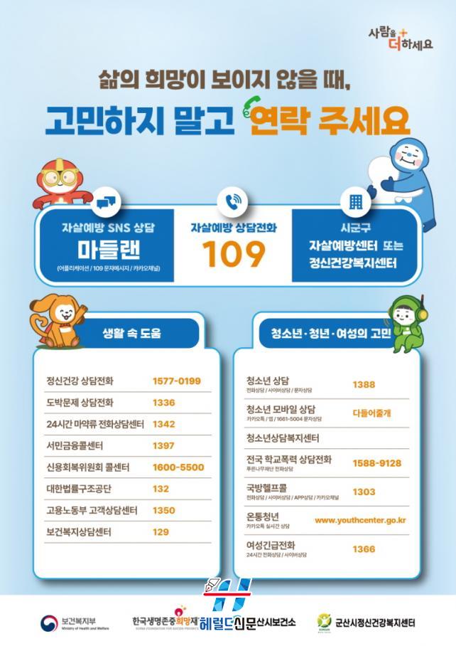 ÇÑÆí, ¿ì¿ï°¨ µî ¸»Çϱ⠾î·Á¿î °í¹ÎÀÌ ÀÖÀ» °æ¿ì Àڻ쿹¹æ »ó´ãÀüÈ(¢Ï109) ¶Ç´Â ±º»ê½Ã Á¤½Å°Ç°º¹Áö¼¾Å͸¦ ÅëÇØ 24½Ã°£ »ó´ãÀ» ¹ÞÀ» ¼ö ÀÖ´Ù.