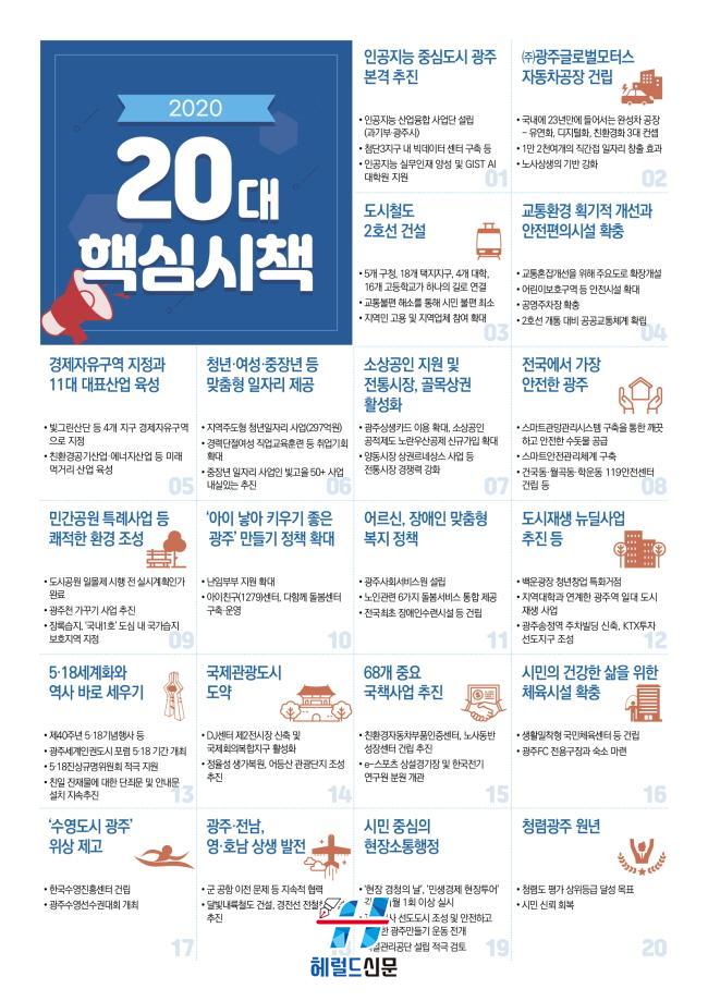 ƯÈ÷ ÀΰøÁö´É Á߽ɵµ½Ã Á¶¼º»ç¾÷ º»°ÝÈ, ¢ß±¤Áֱ۷ιú¸ðÅͽº ÀÚµ¿Â÷°øÀåÀÇ ¼Óµµ°¨ ÀÖ´Â °Ç¸³°ú Áö¿ªÃ»³â ä¿ë, µµ½Ãöµµ 2È£¼± °Ç¼³, °æÁ¦ÀÚÀ¯±¸¿ª°ú 11´ë ´ëÇ¥»ê¾÷À» ±â¹ÝÀ¸·Î ¾çÁúÀÇ ÀÏÀÚ¸® âÃâ, ¹Î°£°ø¿ø Ư·Ê»ç¾÷ÀÇ Â÷Áú ¾ø´Â ÃßÁø, ¾ÈÁ¤ÀûÀÎ ¼öµ¾¹° °ø±Þ°ú ÈÀ硤Àç³ ¿Ïº®ÇÑ ´ëºñ µî 20´ë ÇٽɽÃÃ¥À» ¹àÇû´Ù.
