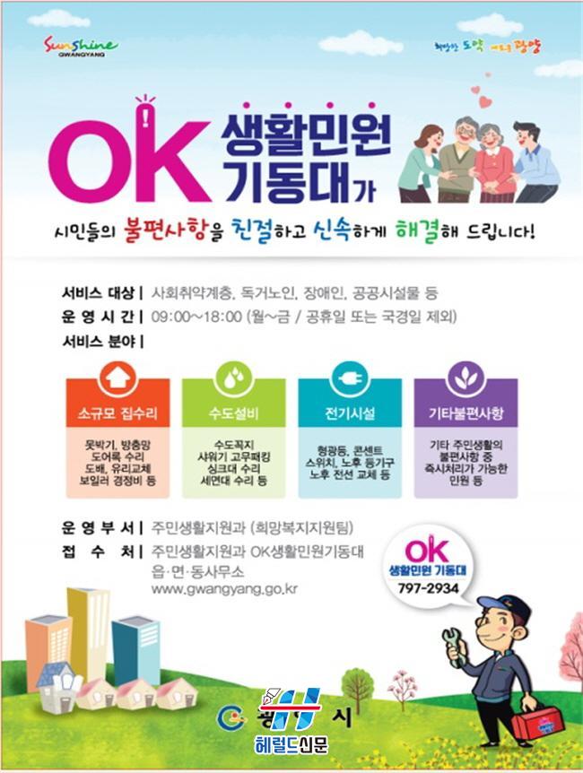 [Çì·²µå½Å¹® = Àü¿µ±Ô ±âÀÚ] ±¤¾ç½Ã´Â 2014³â 6¿ùºÎÅÍ ±âÃʼö±ÞÀÚ ¹× Â÷»óÀ§ °èÃþ°ú ÀÚü ¼ö¼±¿¡ ¾î·Á¿òÀ» °Þ°í ÀÖ´Â µ¶°Å³ëÀΡ¤Àå¾ÖÀÎ µî Ãë¾à°èÃþÀÇ »ýȰºÒÆí ÇØ¼Ò ¼ºñ½º Á¦°øÀ» À§ÇØ Àü´ãÀη 2¸íÀ¸·Î OK»ýȰ¹Î¿ø±âµ¿´ë¸¦ ¿î¿µÇϰí ÀÖ´Ù.
