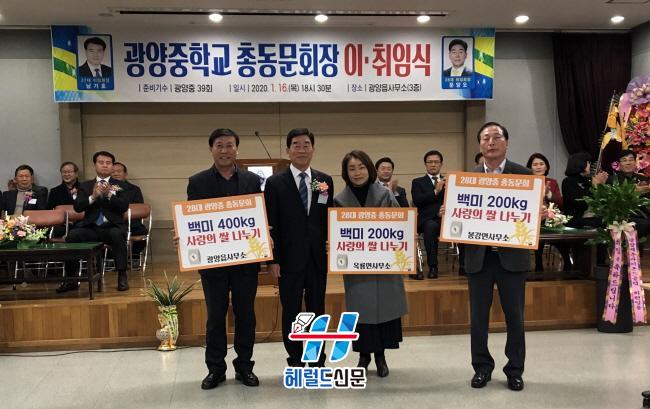 À̳¯ ÀÌ¡¤ÃëÀӽĿ¡¼´Â ±¤¾çÁßÇб³ Ãѵ¿¹®È¸ 27´ë ³²±âÈ£ ȸÀåÀÌ ÀÌÀÓÇϰí, 28´ë ¹®¾ç¿À ȸÀåÀÌ ÃëÀÓÇß´Ù. Çà»ç´Â ÀåÇÐ±Ý Àü´Þ°ú »ç¶ûÀÇ ½Ò ³ª´©±â Àü´Þ½Ä, ³²±âÈ£ ÀÌÀÓ È¸Àå °ø·ÎÆÐ ¼ö¿©¿Í ÀÌ¡¤ÃëÀÓ»ç µîÀ¸·Î ÁøÇàµÆ´Ù.