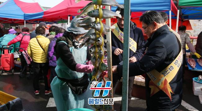 Áö¿ª»ó°¡¿Í Àç·¡½ÃÀå Ȱ¼ºÈ¸¦ À§ÇØ ³ªÀ±¼ö ±ÇÇÑ´ëÇàÀ» ºñ·ÔÇÑ °øÁ÷ÀÚ, ±â°ü»çȸ´Üü µî 200¿© ¸íÀÌ Âü¿©Çß´Ù. À̳¯ ½ÃÀå °÷°÷ÀÇ Á¡Æ÷¿¡¼ ÇÔÆò»ç¶û»óǰ±Ç°ú ¿Â´©¸®»óǰ±ÇÀ» ÀÌ¿ëÇØ °úÀÏ, °Ç¾î¹°, ¾ßä µî ¼³ Á¦¼ö¿ëǰ°ú »ýȰ¿ëǰÀ» ±¸ÀÔÇÏ¿© Áö¿ª »ó±Ç Ȱ¼ºÈ¿¡ ¾ÕÀå¼¹´Ù.