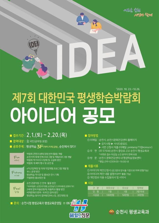[Çì·²µå½Å¹® = Àü¿µ±Ô ±âÀÚ] ¼øÃµ½Ã´Â ¿ÃÇØ 10¿ù 23ÀÏ ~ 26ÀϱîÁö °³ÃֵǴ ¡®Á¦7ȸ ´ëÇѹα¹ Æò»ýÇнÀ¹Ú¶÷ȸ¡¯ÀÇ ¿î¿µ°ú ÇÁ·Î±×·¥¿¡ ¹Ý¿µµÉ ´Ù¾çÇϰí Âü½ÅÇÑ ¾ÆÀ̵ð¾î¸¦ ¸ðÀ¸´Â °ø¸ðÀüÀ» °³ÃÖÇÑ´Ù°í ¹àÇû´Ù.