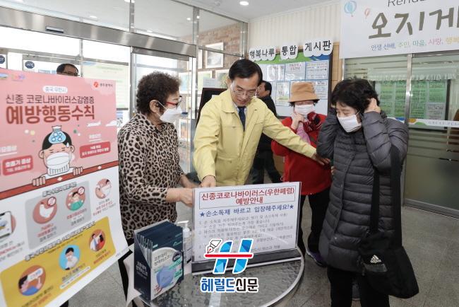 ¸ÕÀú, ±è»ïÈ£ ±¤»ê±¸Ã»ÀåÀº À̳¯ ¿ÀÀü ¼ÛÁ¤µ¿ Çູ³ª·ç³ëÀκ¹Áö°üÀ» ã¾Æ ¾î¸£½Åµé¿¡°Ô ¿¹¹æ¼öÄ¢ÀÌ ´ã±ä È«º¸¹°À» Àü´ÞÇϰí, ¼Õ ¾Ä±â¿Í ¸¶½ºÅ© ¾²±â µîÀ» ´çºÎÇß´Ù. ¾Æ¿ï·¯ ÇÔ²² ÇÑ °øÁ÷ÀÚµé°ú º¹Áö°ü °÷°÷¿¡ Áúº´¿¹¹æ Æ÷½ºÅ͸¦ ºÙ¿´´Ù.