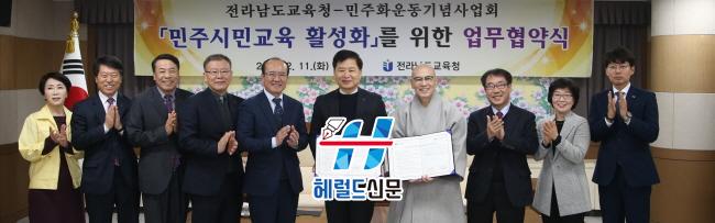 Àü³²±³À°Ã»Àº 11ÀÏ ¿ÀÀü µµ±³À°Ã»¿¡¼ ¹ÎÁÖȿ±â³ä»ç¾÷ȸ¿Í ¾÷¹«Çù¾àÀ» ü°áÇϰí, ¹ÎÁÖȿ Á¤½Å °è½ÂÀ» ÅëÇØ ¹ÎÁֽùα³À°À» È®´ëÇØ ³ª°¡±â·Î Çß´Ù. Çù¾à½Ä¿¡´Â Àå¼®¿õ ±³À°°¨À» ºñ·ÔÇÑ µµ±³À°Ã» °£ºÎ¿Í ¹ÎÁÖȿ±â³ä»ç¾÷ȸ Áö¼± ÀÌ»çÀåÀ» ºñ·ÔÇÑ °ü°èÀÚ µî 10¿© ¸íÀÌ Âü¼®Çß´Ù.