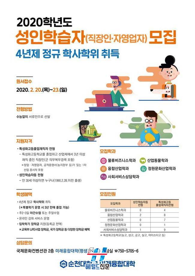 [Çì·²µå½Å¹® = Àü¿µ±Ô ±âÀÚ] ¼øÃµ´ëÇб³(ÃÑÀå °í¿µÁø) ¹Ì·¡À¶ÇÕ´ëÇÐÀº ÀÌ´Þ 20ÀϺÎÅÍ 23ÀϱîÁö 2020Çг⵵ ¼ºÀÎÇнÀÀÚ¿Í Æ¯¼ºÈ°íÁ¹¾÷ ÀçÁ÷ÀÚ ´ë»ó ½ÅÀÔ»ýÀ» Ãß°¡ ¸ðÁýÇÑ´Ù°í ¹àÇû´Ù.