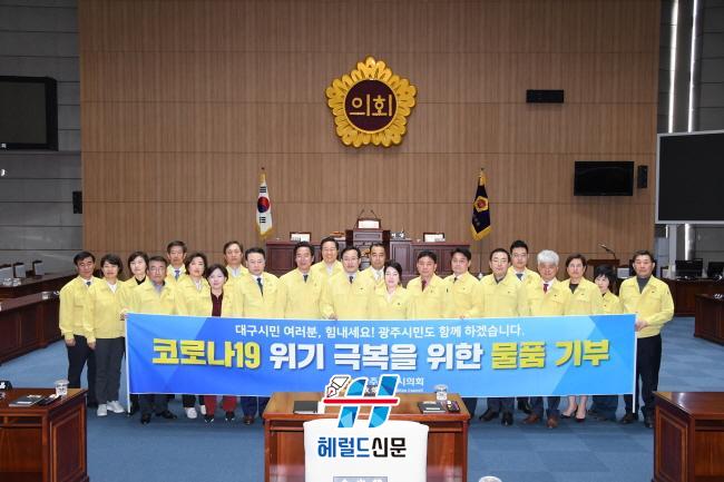 [Çì·²µå½Å¹® = ¹®»óÁØ ±âÀÚ] ±¤ÁÖ±¤¿ª½ÃÀÇȸ(ÀÇÀå ±èµ¿Âù) ÀÇ¿ø Àϵ¿ÀÌ Äڷγª19·Î ¾î·Á¿òÀ» °Þ°í ÀÖ´Â ´ë±¸½Ã¹ÎÀ» ÀÀ¿øÇϱâ À§ÇØ ´ë±¸±¤¿ª½ÃÀÇȸ(ÀÇÀå ¹èÁö¼÷)¿¡ ±âºÎ¹°Ç°À» Àü´ÞÇß´Ù.
