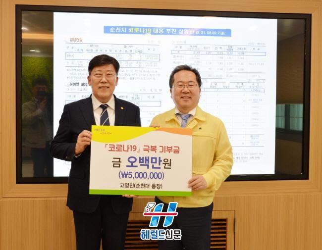 [Çì·²µå½Å¹® = Àü¿µ±Ô ±âÀÚ] °í¿µÁø ¼øÃµ´ëÇб³ ÃÑÀåÀÌ Äڷγª19 ±Øº¹À» À§ÇØ ¼øÃµ½Ã Çã¼® ½ÃÀåÀÌ Á¦¾ÈÇØ ÃßÁøÇϰí ÀÖ´Â ¡®¼øÃµÇü ±ÇºÐ(ÏíÝÂ)¿îµ¿¡¯¿¡ µ¿ÂüÇϰíÀÚ 31ÀÏ ¿ÀÈÄ 3½Ã ¼øÃµ½Ãû¿¡¼ 500¸¸ ¿øÀÇ ¼º±ÝÀ» ±âŹÇß´Ù.