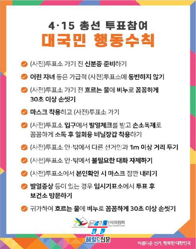¶ÇÇÑ,¡®4.15 ÃѼ± ÅõÇ¥Âü¿© ±¹¹Î Çൿ¼öÄ¢¡¯(ºÙÀÓ 2 ÂüÁ¶)¿¡ µû¶ó ÅõÇ¥ÇÏ·¯ ¿À´Â À¯±ÇÀÚ´Â ¸¶½ºÅ©¸¦ Âø¿ëÇϰí ÅõÇ¥¼Ò¿¡¼´Â ´ëȸ¦ ÀÚÁ¦Çϸç, 1m ÀÌ»ó °Å¸® µÎ±â µî ÅõÇ¥»ç¹«¿øÀÇ Áú¼À¯Áö ¿äû¿¡ Àû±ØÀûÀ¸·Î ÇùÁ¶ÇØ ÁÙ °ÍÀ» ´çºÎÇÏ¿´´Ù.