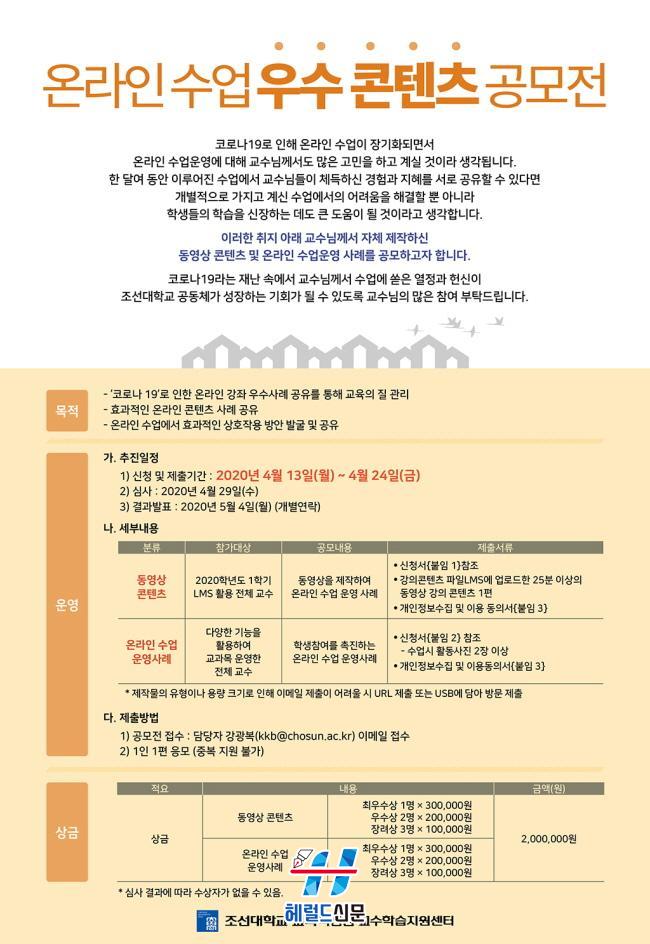 Á¶¼±´ëÇб³´Â ¿Â¶óÀÎ °ÀÇ ¿ì¼ö»ç·Ê¸¦ ¹ß±¼ÇÏ°í °øÀ¯Çϱâ À§ÇØ ¡®¿Â¶óÀÎ ¼ö¾÷ ¿ì¼ö ÄÜÅÙÃ÷ °ø¸ðÀü¡¯À» °³ÃÖÇÑ´Ù. Á¶¼±´ëÇб³´Â ¿Â¶óÀÎ °ÀÇ ¿ì¼ö»ç·Ê ½Ã»óÀ» ÅëÇØ ÁÖµµÀûÀÎ ¿Â¶óÀÎ °Àǹý ¿ª·® °È¸¦ À¯µµÇÒ ¸ñÀûÀ¸·Î À̹ø °ø¸ðÀüÀ» ¸¶·ÃÇß´Ù.
