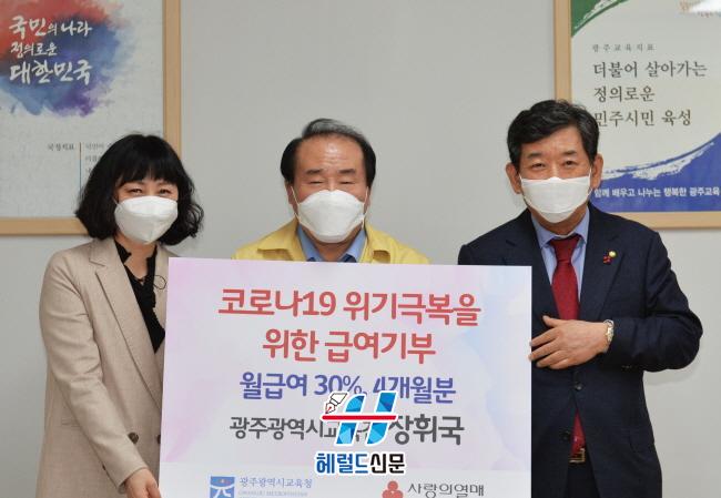 [Çì·²µå½Å¹® = ¹®»óÁØ ±âÀÚ] ÀåÈÖ±¹ ±³À°°¨ÀÌ Äڷγª19 ±Øº¹À» À§ÇØ ±Þ¿©ÀÇ 30%¸¦ ±¤ÁÖ»çȸº¹Áö°øµ¿¸ð±Ýȸ¿¡ 17ÀÏ ±âºÎÇß´Ù.