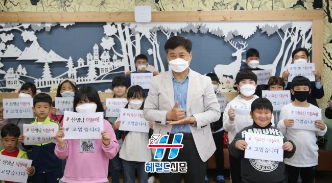 Àå¼®¿õ ±³À°°¨Àº 4ÀÏ(¿ù) ¸ñÆ÷ »êÁ¤ÃʵîÇб³¿Í ¼ºÎÀ¯Ä¡¿øÀ» ¹æ¹®ÇØ ±ä±Þ µ¹º½±³½Ç¿¡ Âü¿©Çϰí ÀÖ´Â Çлý(¿ø»ý)µé°ú ÇÔ²² ¡®´öºÐ¿¡¡¯ 縰Áö Ä·ÆäÀÎÀ» ¹úÀÎ µÚ °ü·Ã ¿µ»ó°ú »çÁøÀ» ÀÚ½ÅÀÇ »çȸ°ü°è¸Á¼ºñ½º(SNS)¿¡ ¿Ã·È´Ù.