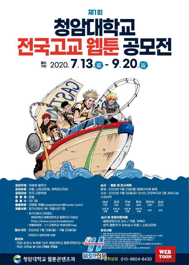 ÇÑÆí, ÃÖÁ¾ ´ç¼±ÀÛÀº 9¿ù 21ÀÏ Ã»¾Ï´ëÇб³ À¥Å÷ÄÜÅÙÃ÷°ú ȨÆäÀÌÁö(http://www.ca.ac.kr/webtoon)¿¡ ¹ßÇ¥µÈ´Ù. À¥Å÷°ø¸ðÀüÀÇ ¼ö»óÀÛ ÀúÀÛ±ÇÀº û¾Ï´ëÇб³·Î ±Í¼ÓµÇ¸ç, ÇâÈÄ ´ëÇРȨÆäÀÌÁöÀÇ È«º¸¿ë ÄÜÅÙÃ÷·Î Ȱ¿ëÇÒ °èȹÀÌ´Ù. Âü°¡½Åû¼ µî °ø¸ðÀü °ü·Ã ÀÚ¼¼ÇÑ »çÇ×Àº û¾Ï´ë À¥Å÷ÄÜÅÙÃ÷°ú ȨÆäÀÌÁö¸¦ ÅëÇØ È®ÀÎ °¡´ÉÇÏ´Ù.